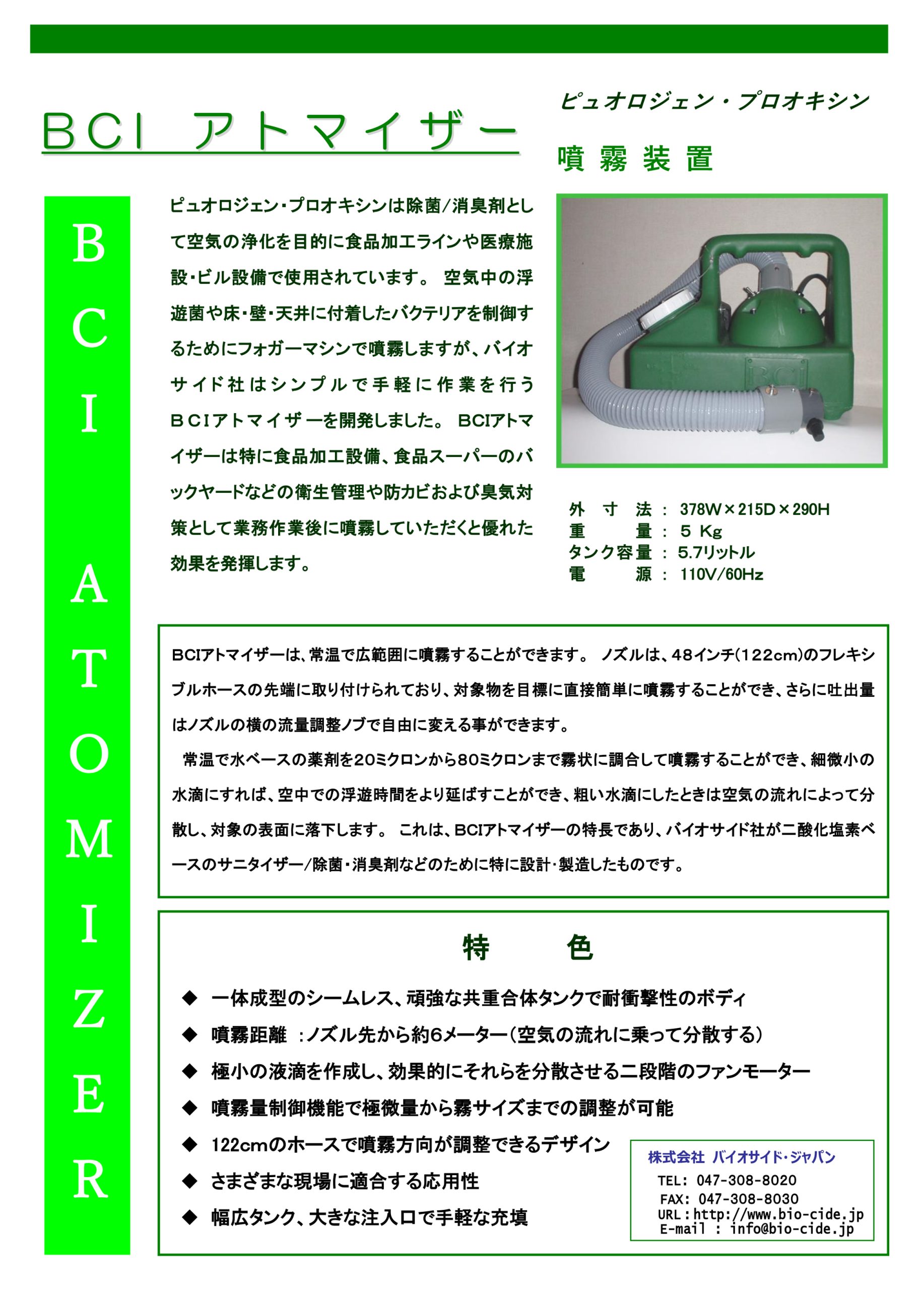 空気中の浮遊菌や床・壁・天井に付着したバクテリアを制御するために、バイオサイド社はシンプルで手軽に作業を行うBCIアトマイザーを開発しました。 水成二酸化塩素製剤を20ミクロンから80ミクロンまで霧状に調合して噴霧することができ、細微小の水滴にすれば、空中での浮遊時間をより延ばすことができ、粗い水滴にしたときは空気の流れによって分散し、対象の表面に落下します。これは、BCIアトマイザーの特長であり、バイオサイド社が二酸化塩素ベースのサニタイザー/除菌・消臭剤などのために特別に設計・製造したものです。